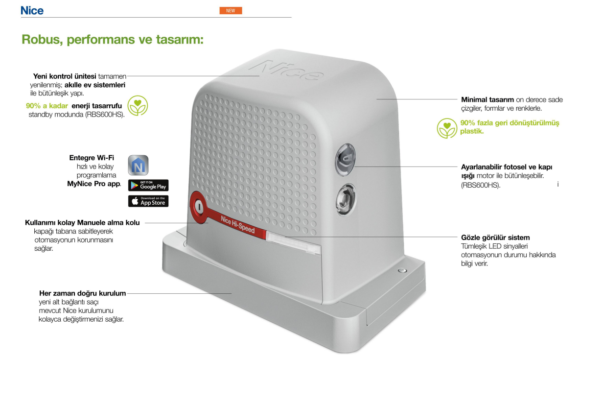 Nice Robus 600 Kapı motoru, ortalama ağırlığa sahip yanakayar kapılar için oldukça bol özellikli bir motordur. Minimal dış tasarımı ve şık kumandaları ile de bahçelerinize, işyerlerinize farklı bir hava katar.
